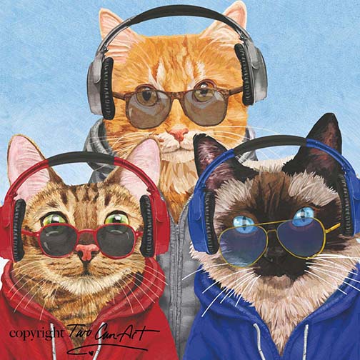 Our Cool Cats Wall Art design is created entirely from painted textures created by Noah who is Autistic. His mother Patti has collaged them together to create the image of 3 cool cats listening to pod casts and music. No Frame is needed as the image is mirrored on the 1″1/2″ sides all around on canvas. This is also available on Fine Art Paper at 12″x12″ or 18″x18″