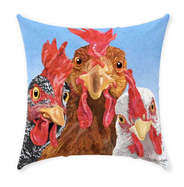 Our Judgy Chickens art is on this 18 inch cozy throw pillow featuring high-quality fabric. spot clean only