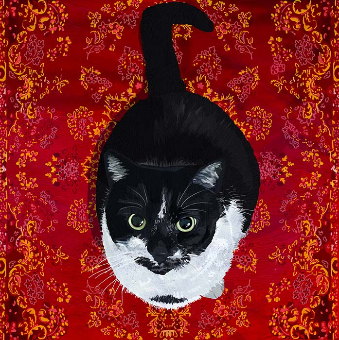 Our Tuxedo Cat Wall Art design is created entirely from painted textures created by Noah who is Autistic. His mother Patti has collaged them together to create the image of an adorable tuxedo cat looking up. No Frame is needed as the image is mirrored on the 1″1/2″ sides all around on canvas. This is also available on Fine Art Paper at 12″x12″ or 18″x18″