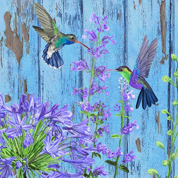 Hummingbirds Wall Art-The design is created entirely from painted textures created by Noah who is Autistic. His mother Patti has collaged them together to create the image of a duo of hummingbirds in a garden. No Frame is needed as the image is mirrored on the 1″1/2″ sides all around on canvas. This is also available on Fine Art Paper at 12″x12″ or 18″x18″